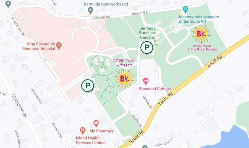 Location: The Bermuda Botanical Gardens, 169 South Road, Paget. The class will take place on the western side of the park (the hospital side), near the sensory gardens and under a large banyan tree. Please see a map attached for exact location. There will be Kindermusik signs placed to direct you.